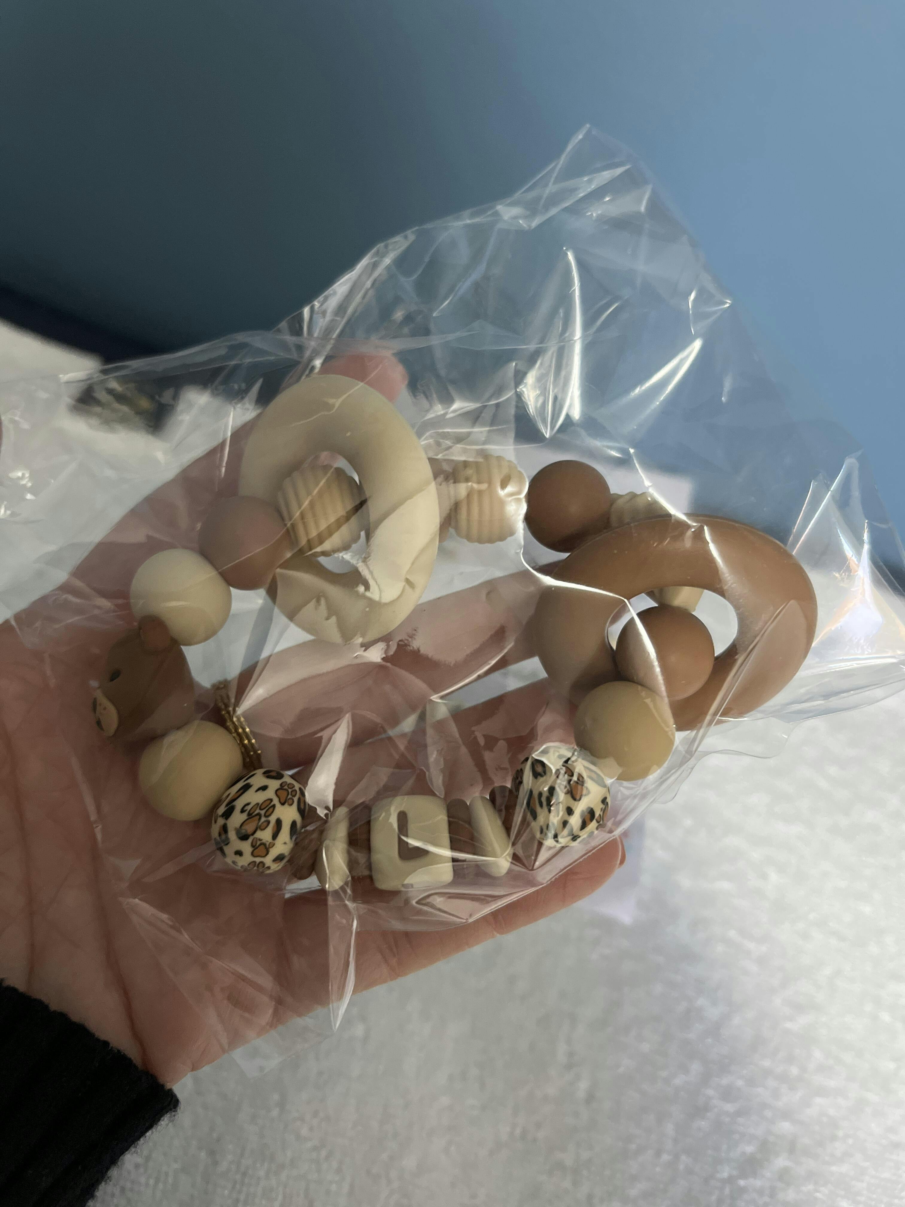 • Lettres du prénom en silicone crème-choco, caractères spéciaux disponibles: Ë, Ï, É